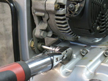 The Poly V belt is tensioned using a toothed adjuster which is part of the lower left mounting bolt. All three fasteners are loosened, then the adjusting bolt is turned to lift the alternator. When there is 8 Nm torque on the bolt, the three fasteners are tightened.