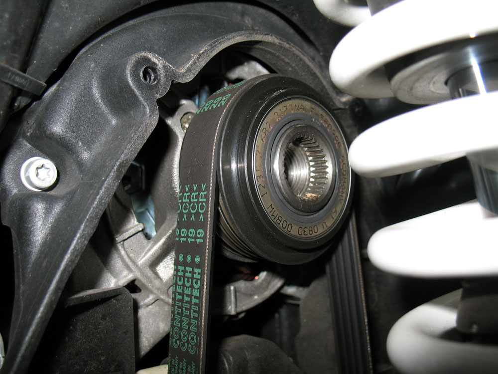 ELAST, a stretchy belt introduced in July 2003 (2004 models). This was used with '04 and later 50A alternators and all Hexhead alternators. True to its name, this is an elastic belt, which is stretched to a predetermined length. The elasticity provides the tension. On the 50A and 55A models using this belt, a freewheeling pulley on the alternator reduces the belt load.** By 'freewheeling' I mean that it works just like a bicycle; the pulley will turn the alternator in the normal direction, but if the pulley slows down, as it does in the course of normal engine vibration, the alternator will continue to spin if conditions permit. This eliminates all of the 'backward' loading on the belt. Since the distance between the pulleys doesn't change, there is no need to re-tension this belt during its life.