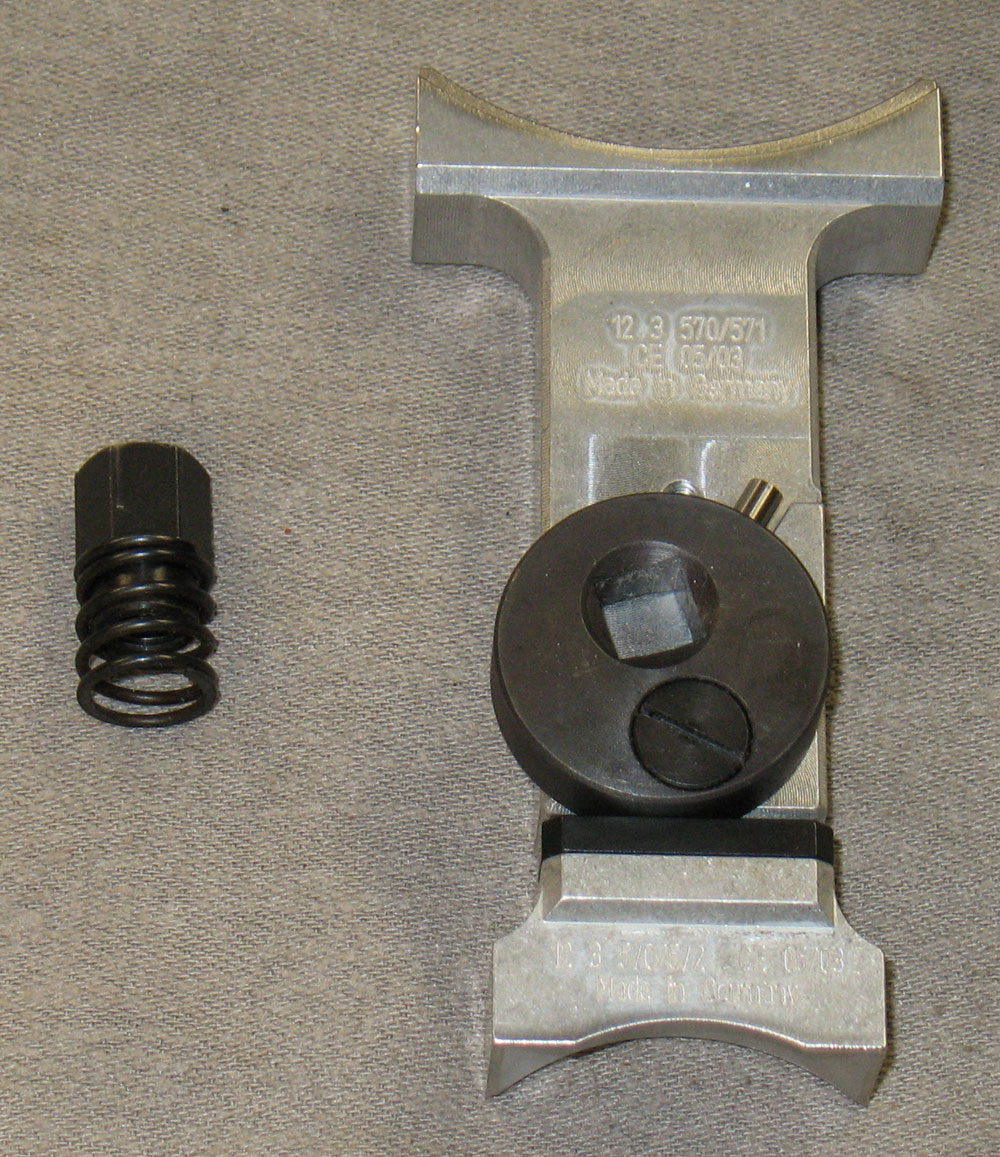 When the R1150RS was introduced, changes to the wiring harness made it difficult to access the head of the adjuster bolt, so a tool was created to torque this bolt from the threaded end (in front). This relatively inexpensive tool is little more than a nut with a closed end and a spring; it threads over the end of the bolt until it bottoms out, then can be used to turn the bolt. It can be used on all bikes with Poly V belts.
