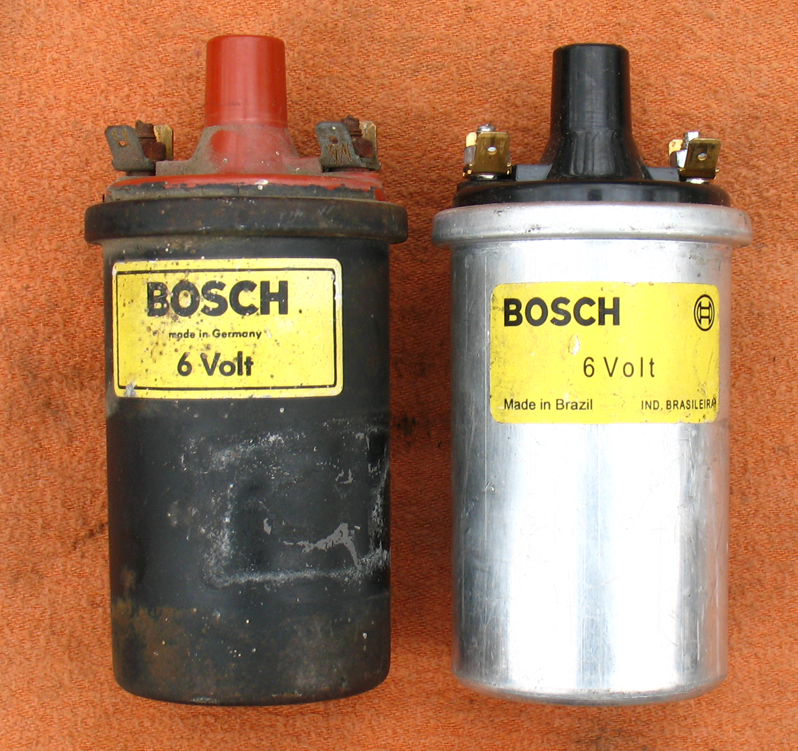 Total coil resistance should be about 3 Ohms for points ignition, which usually means two 1.5 Ohm coils like the ones shown here. The short ones shown are 12 13 1 243 452, Bosch 0 221 100 028, with 6k~7k Ohms secondary, and the new taller one (not shown, from Motorrad Elektrik) is Bosch 0 221 124 001 with about 15k Ohms secondary. An alternative is the dual output Dyna green coil.