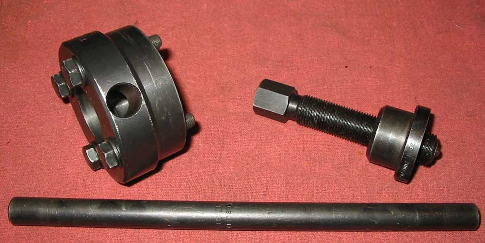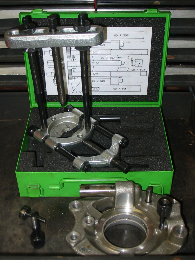 Still in the foam are two extensions for the side rods.You'll also want the 11 1 690 press piece shown lying sideways at the bottom, and the two 11 1 680 adapters used to pull things like front main bearing carriers. These connect the M10x1.5 threads on the side rods with the M8x1.25 threaded holes. One is shown in position in a bearing carrier at the bottom of the photo; the other is standing upright.