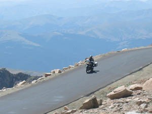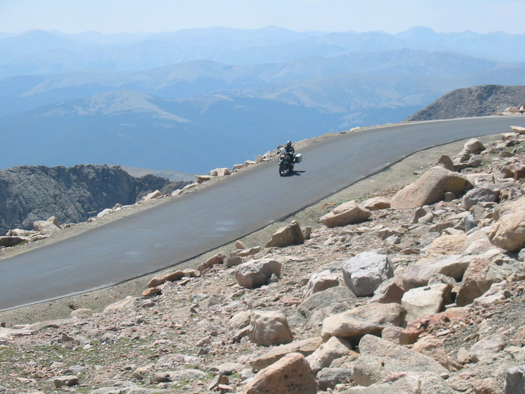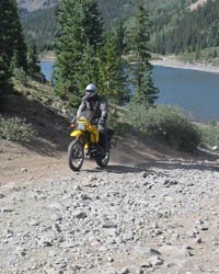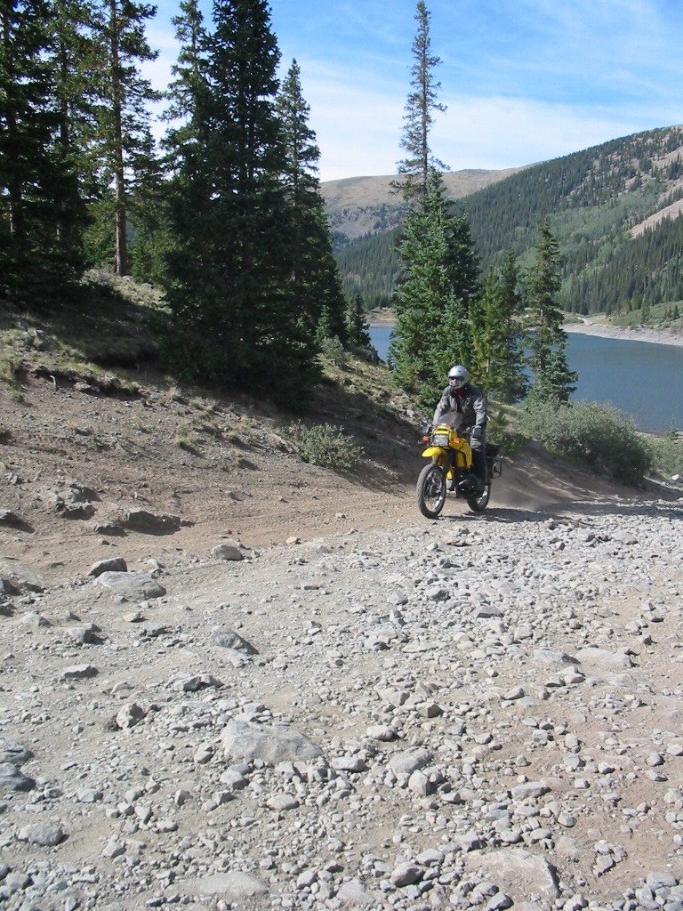 The bottom of Cottonwood leads to Taylor Reservoir, and we continued south to Tincup. Tincup is a town of small huts that seems to cater entirely to people riding and hunting in the mountains. We went through Tincup, thinking we would cross Tincup Pass and get back to Buena Vista via St. Elmo, or go down to Pitkin and work our way back home via US50, but a few miles in we could see that it just wasn't going to happen. Some really rough sections at the bottom just past the lake were more than we wanted to deal with, and ATV riders coming from St. Elmo said it was a lot worse further up. It looked like we could have gotten past the rocks and then had a clear trail until we were above the treeline, but I needed to save the bike (Meredith was riding it today!) for the next two days and we didn't want to get back too late, so we turned back and backtracked to Buena Vista where we started finding clumps of GS riders all over the place. The first group of people we met, I ended up riding with the next day. Ronnie, Dale and Tim were hanging around at one of the Motels and we had a beer together and changed Meredith's rear tire (which I had sent from the east coast in Barry's trailer). Dinner, and back to the tent for the night. Big day tomorrow. |