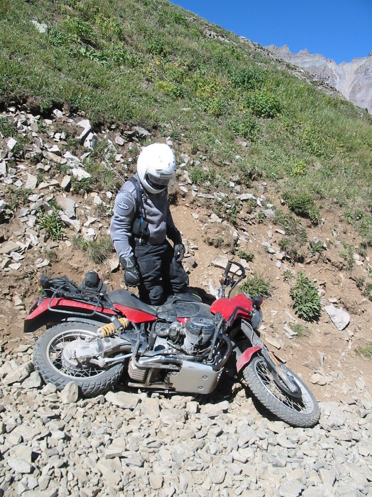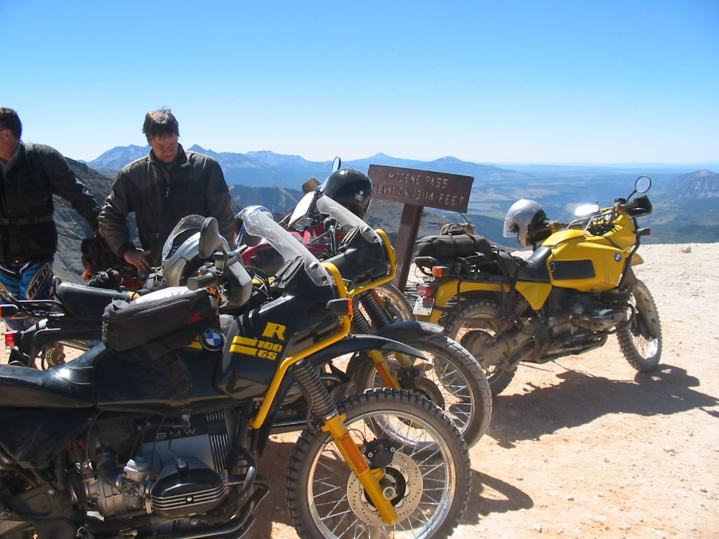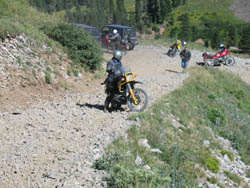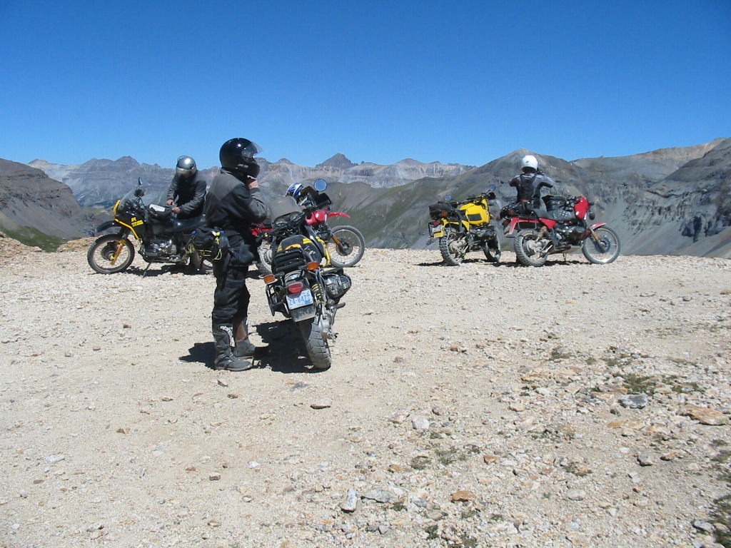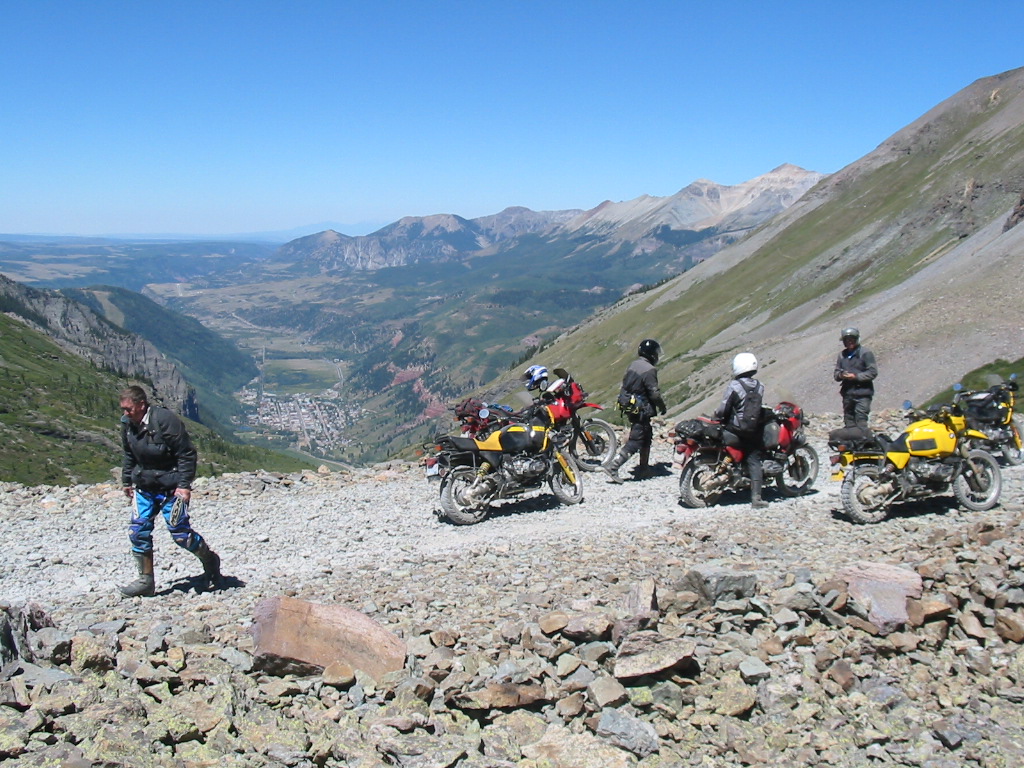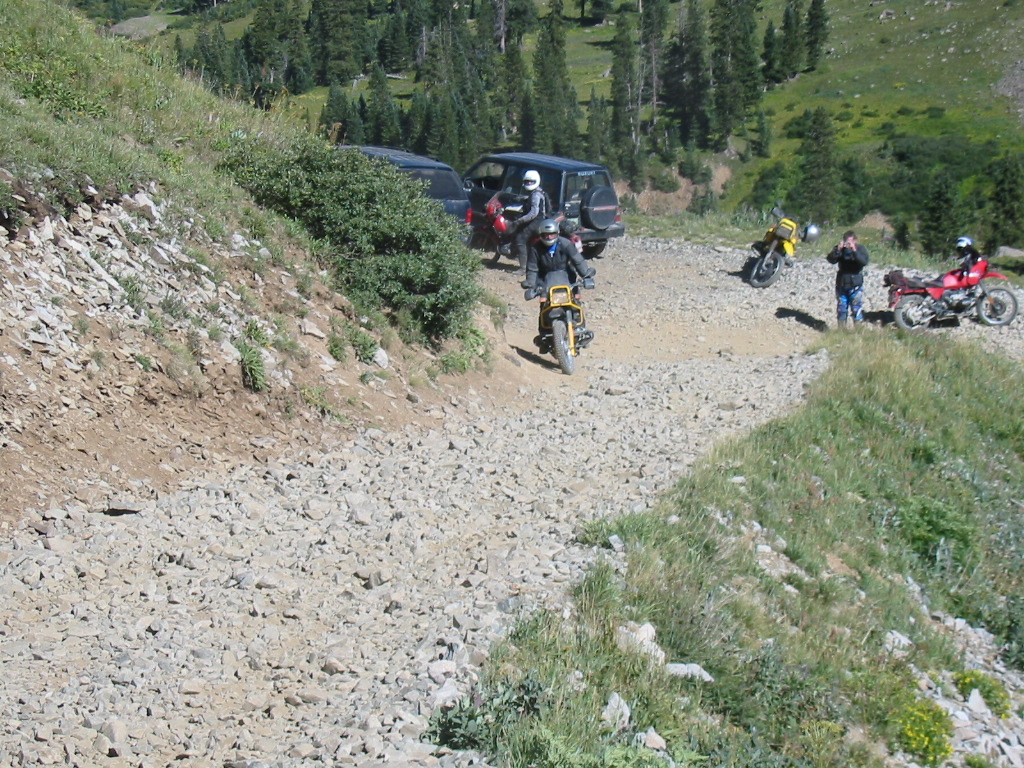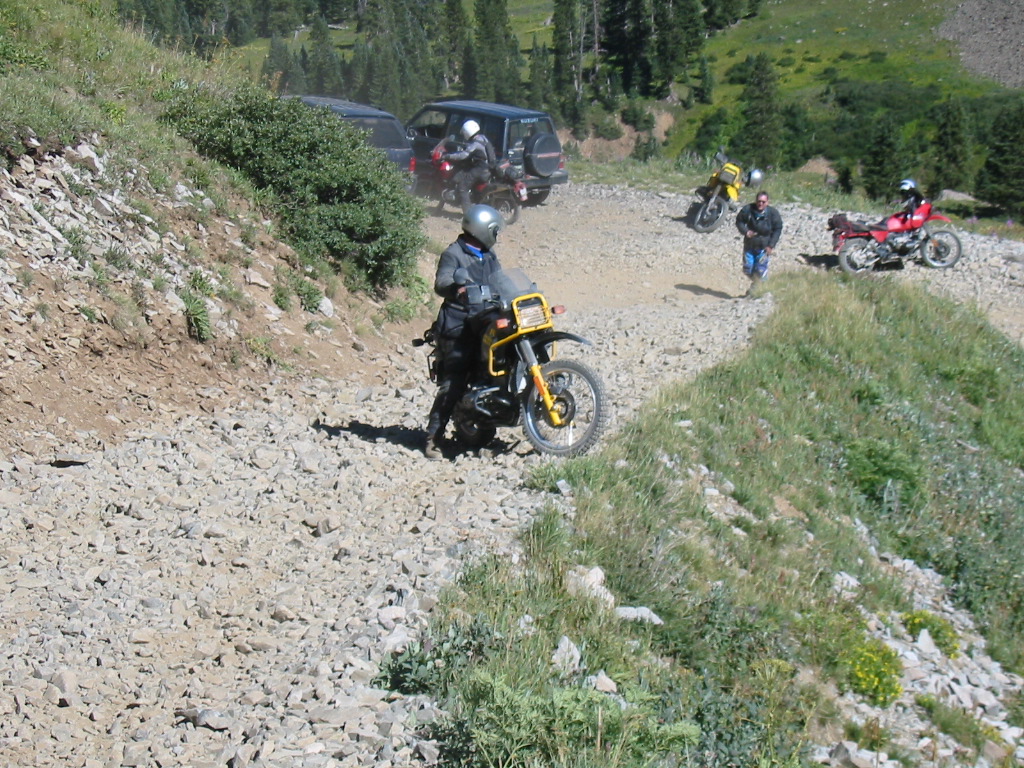 No problem. What a great bike. In fact, I was so pumped up at that point that I didn't want to head back yet (Imogene was the last pass on the A ride, but it was way too early to quit) so most of us headed away from Ouray, up the valley to Yankee Boy Basin. This started off as a nice rough road and turned suddenly difficult about 3/4 to the top. In fact, one part was damned near impassable and most of us called it a day. A new member of our group on an R80, who had joined us on Black Bear Pass, had gone ahead of us and was further up the basin. Sasha and Dale made valiant eforts to get up but had gotten thwarted. After a bit of reflection, Ronnie and I eventually scrambled up to join the R80, and the three of us continued to the top of the basin which was about 13,000 feet. The others decided to call it a day and headed back to join Tim, who had deferred to the needs of his hurt leg and not joined us for the detour to Yankee Boy. Getting to the top of that was the high point of the trip for me. I had been feeling a bit wimpy since we had traded a difficult pass (Stony) for some easier ones (Cinnamon and Engineer) the day before, due to time constraints. However, this made up for it and more. It was a difficult stretch, and enough of an addition to the route that I felt that we had made up our lost ground. :)