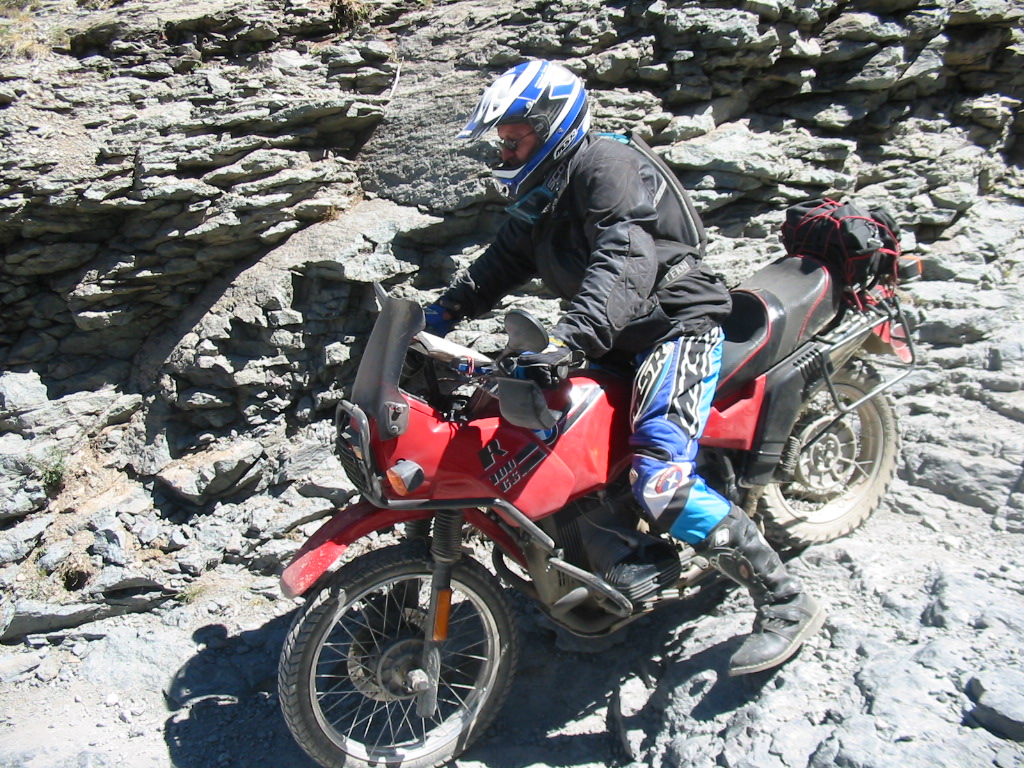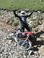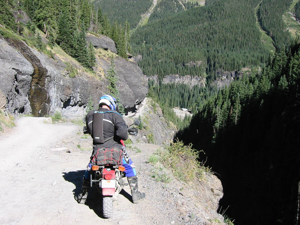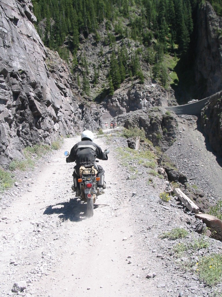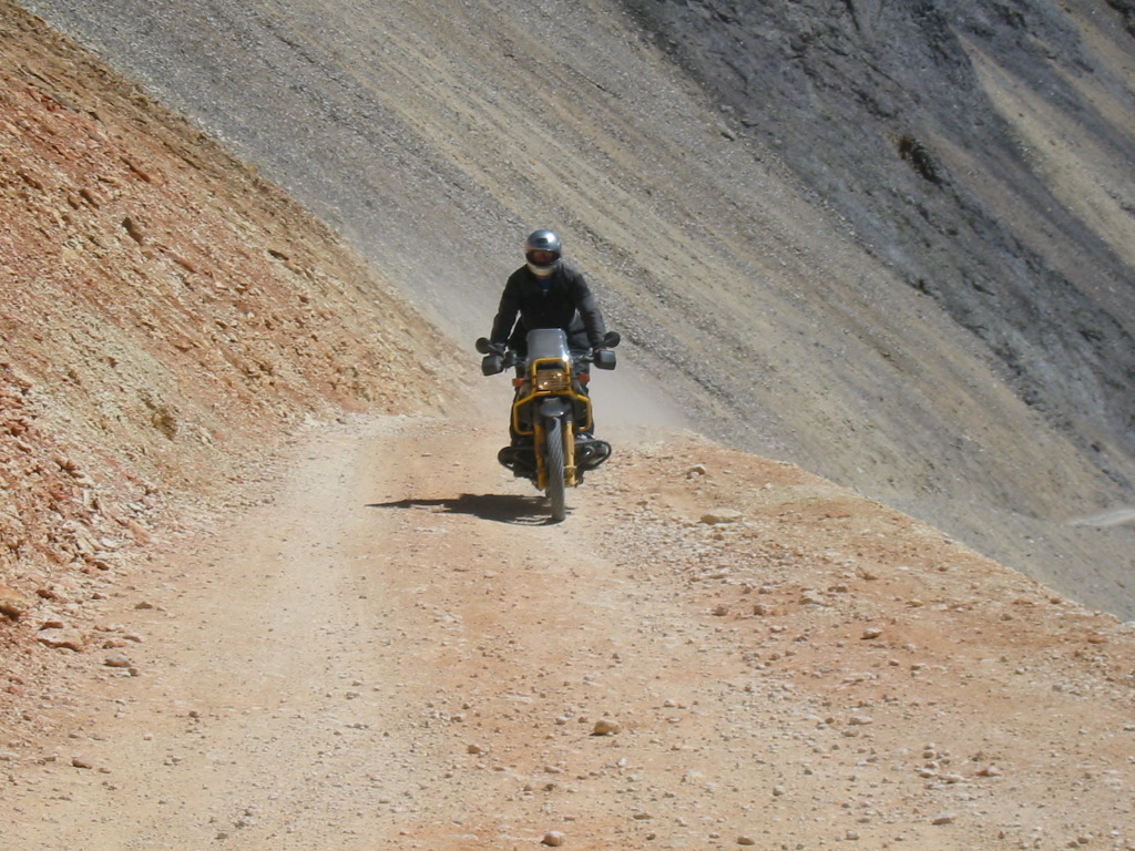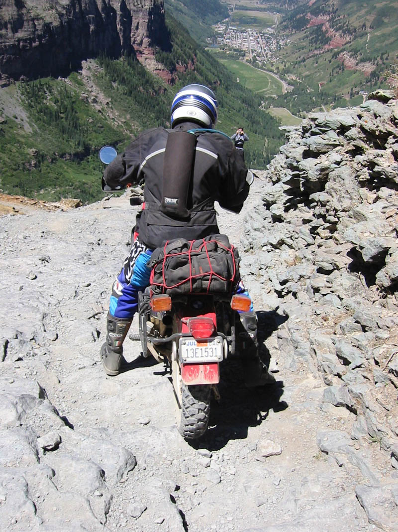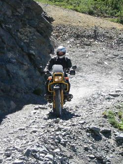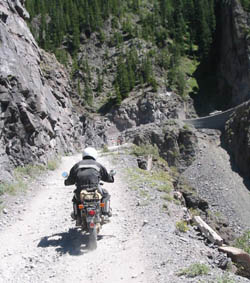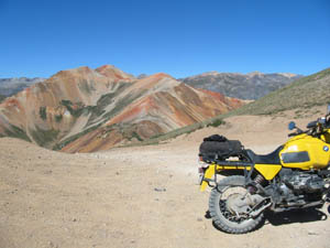 No problem. What a great bike. In fact, I was so pumped up at that point that I didn't want to head back yet (Imogene was the last pass on the A ride, but it was way too early to quit) so most of us headed away from Ouray, up the valley to Yankee Boy Basin. This started off as a nice rough road and turned suddenly difficult about 3/4 to the top. In fact, one part was damned near impassable and most of us called it a day. A new member of our group on an R80, who had joined us on Black Bear Pass, had gone ahead of us and was further up the basin. Sasha and Dale made valiant eforts to get up but had gotten thwarted. After a bit of reflection, Ronnie and I eventually scrambled up to join the R80, and the three of us continued to the top of the basin which was about 13,000 feet. The others decided to call it a day and headed back to join Tim, who had deferred to the needs of his hurt leg and not joined us for the detour to Yankee Boy. Getting to the top of that was the high point of the trip for me. I had been feeling a bit wimpy since we had traded a difficult pass (Stony) for some easier ones (Cinnamon and Engineer) the day before, due to time constraints. However, this made up for it and more. It was a difficult stretch, and enough of an addition to the route that I felt that we had made up our lost ground. :)