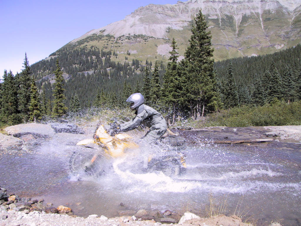 Once we got past the first 1/4 mile, there was basically no traffic again. We had a great time, zooming down the winding route with the sun in mid-afternoon position. Below treeline, we had a few water crossings and then some wooded roads where we were mercifully rock-free for a while. It was here that I found out how comfortable I was 'pushing' this bike. On a few deep ditches in the road I took the steepest route just to see if the bike would negotiate it. No problem. So then I started riding up some rock ledges in the road - no problem. Right about that time Sasha did a great 'berm shot' catching rear-wheel air off a mound of dirt along the trail, reminding me that I wasn't pushing THAT hard yet. So when I came upon a 4x4 creeping to the right to get over a pretty substantial ledge, I passed on his left on the steeper part (way steeper than what I had done before). No problem, although moments later I realized that he hadn't gone over there to let me by and was now turning left to cut me off, so I turned left with him, halfway up the ledge and banked off it doing a berm-shot of my own, and completing the pass at the same time.