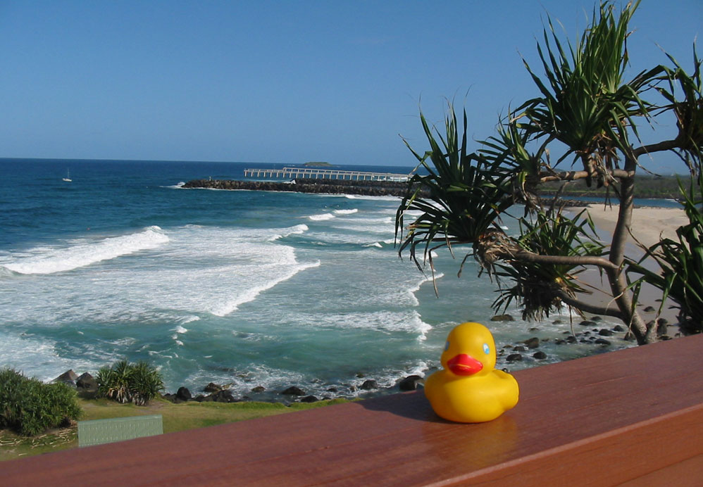 It's not always fun and games. Ducky has faced grave peril at times, from being buried in the sand in Italy to being lost in lake Tahoe. He puffs up with altitude and can't float straight. His beak has been rubbed raw by careless handling.
