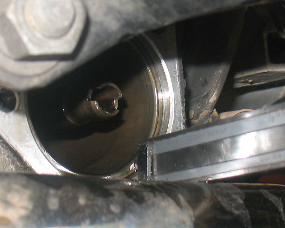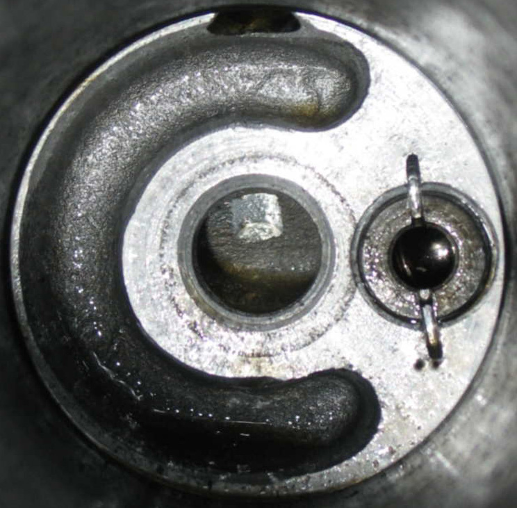 At the bottom of the filter housing is a spring-loaded ball valve which allows oil to bypass the filter if the pressure gets too high. In this case, unfiltered oil will be sent to the engine. When the engine is cold, oil will normally flow through this bypass. If the bypass valve breaks, oil will flow through here when the engine is wrm also. Shown to the right is a broken bypass valve; the owner noticed that the cooler was never getting hot. The problem was that oil was not being directed through the filter at all, and therefore was not going into the cooler (see canister page for a diagram of how that works).