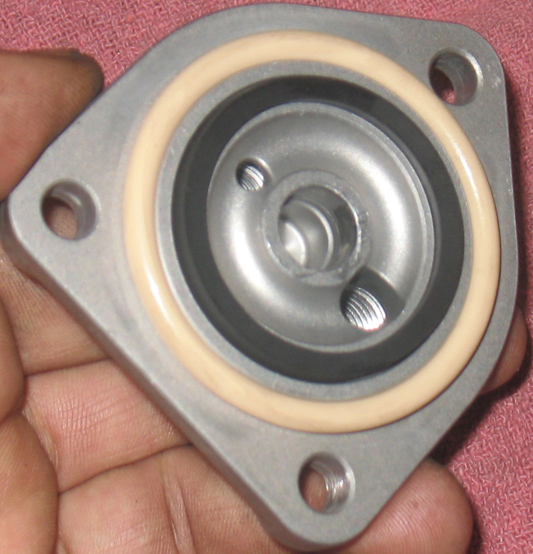 It's slightly different with a cooler cover, where the much longer center pipe extends into the cover. With the thermostat cover (shown left), the outer hole is open to the inner hole at low temperatures, allowing oil to make a U-turn inside the cover and go back out the pipe. As the thermostat opens, some oil is allowed to go out to the cooler.