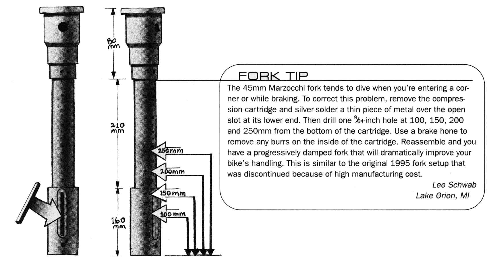 Secondary flow: Some oil has to leave the damper assembly because as the fork compresses the volume that's taken up by the wall of the fork tube displaces oil, pushing it above the damper and into the area where the main fork spring is (to the right of the illustration). When the fork extends, it withdraws oil from the spring area to refill the damper. This amount of oil doesn't represent the entire volume of the fork during that compression, only the volume that the walls of the fork tube require. On these forks, that's about 3.5cc of oil per centimeter of fork travel.